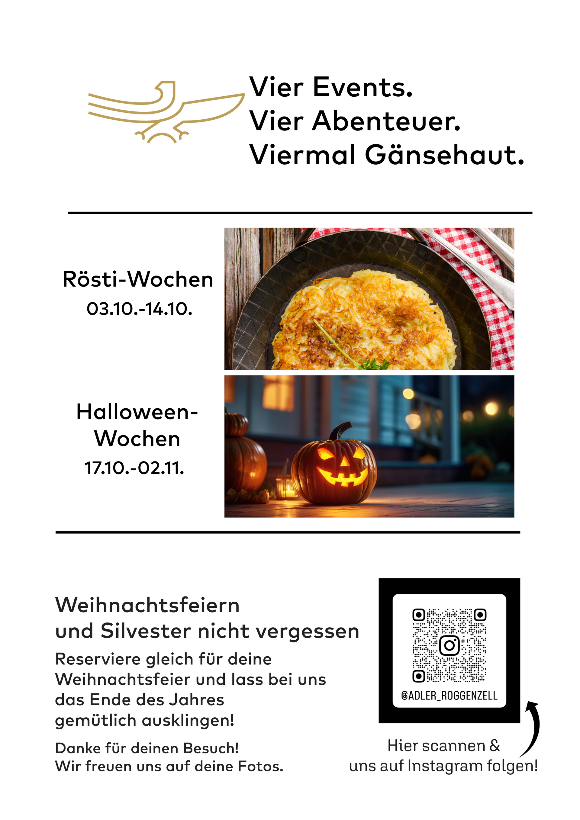 „Vier Events. Vier Abenteuer. Viermal Gänsehaut. ✨ #rösti #halloween #weihnachten #silvester In den nächsten Wochen wird es laut, bunt und voller Energie 🚀 – jeder Termin bringt seinen ganz eigenen Charm mit sich. Noch verraten wie nicht zu viel… aber eins ist sicher: es wird unvergesslich 💫 #Events #Highlight #ComingSoon #EventSeason #Vorfreude #SaveTheDate #EventLife #Unforgettable #StayTuned #wangen #lindau #ravensburg #bodensee #roggenzell #adlerroggenzellButton